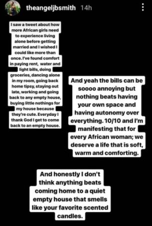 “And yeah the bills can be so annoying but nothing beats having your own space and having autonomy over everything. 10/10 and I am manifesting that for every African woman; we deserve a life that is soft, warm and comforting.” she added.