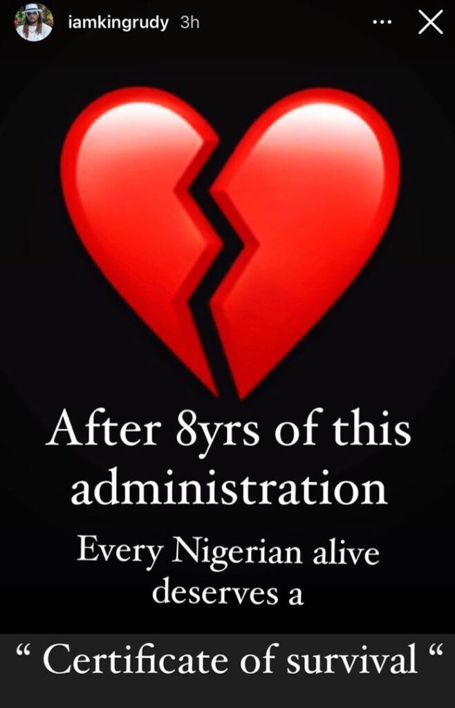 Nigeria is bleeding and most people including Rudeboy are heartbroken and that is why he thinks every Nigerian alive today is a survivor who deserves a certificate of survival.