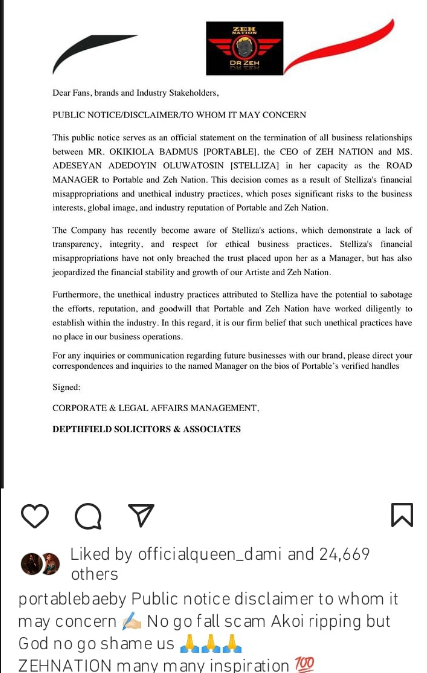 “Public Notice Disclaimer to whom it may concern. No go fall scam akoi ripping but God no go shame us. Zeh Nation many many inspiration”.