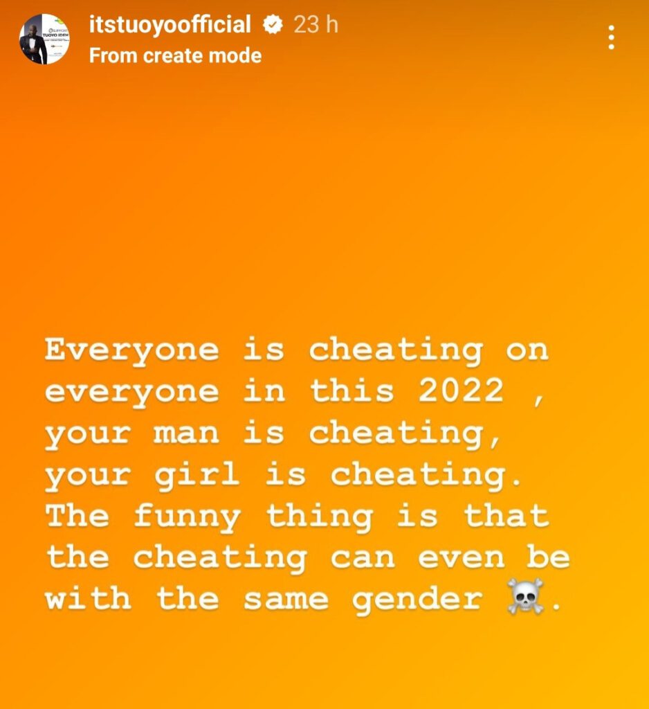BBNaija’s star, Tuoyo has said that “everyone” is cheating on their partners in 2022.