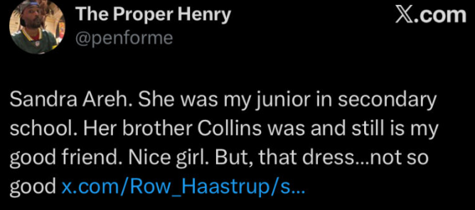 However, the former schoolmate did note one aspect of her recent public appearance that he disliked: her choice of outfit. In his post, he said, “Sandra Areh. She was my junior in secondary school. Her brother Collins was and still is my good friend. Nice girl. But, that dress. Not so good,”.