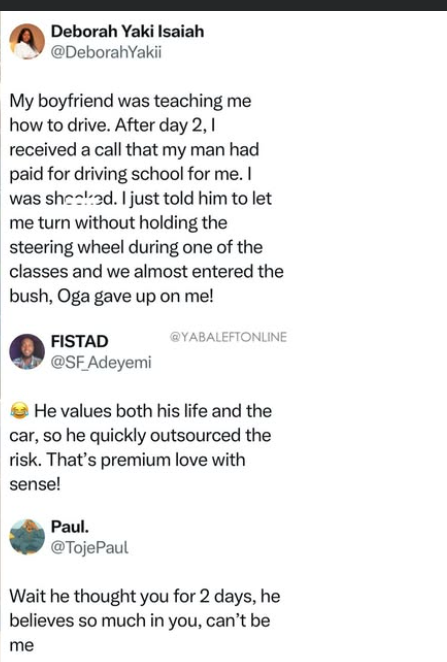 In other news….. A young Nigerian lady, Deborah Yaki Isaiah, has taken to social media to narrate her hilarious driving lesson experience that ended with her boyfriend enrolling her in a driving school.