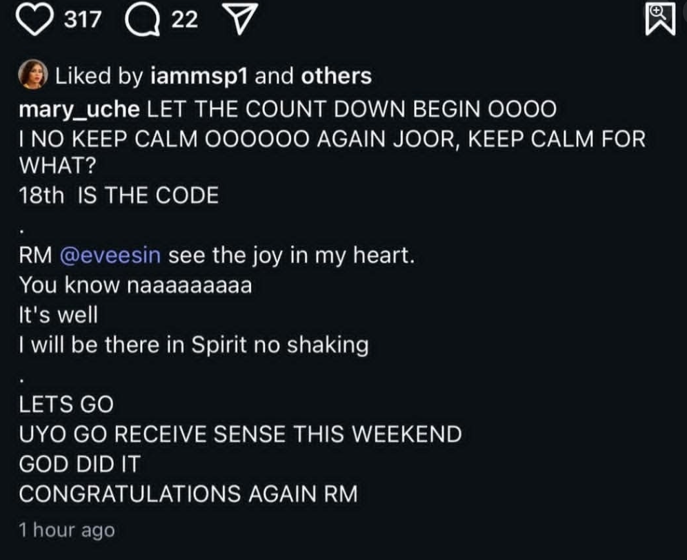 - Actress Mary Uche shared the joyful news in a post filled with excitement, hinting that “18th is the code” while congratulating her colleague.