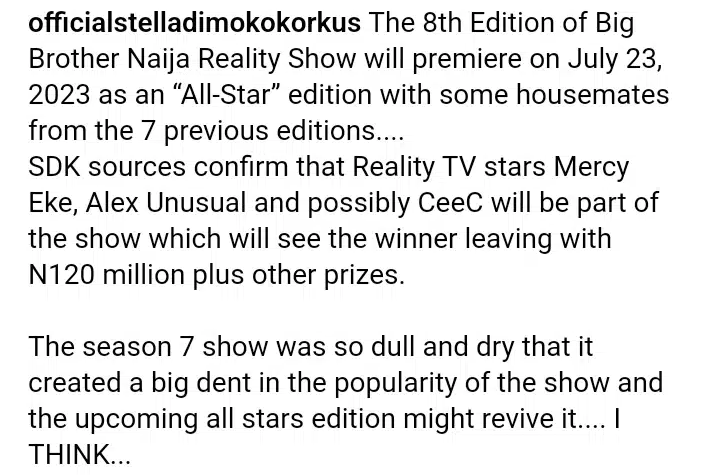 “The 8th Edition of Big Brother Naija Reality Show will premiere on July 23, 2023 as an “All-Star” edition with some housemates from the 7 previous editions.;SDK sources confirm that Reality TV stars Mercy Eke, Alex Unusual and possibly CeeC will be part of the show which will see the winner leaving with N120 million plus other prizes.