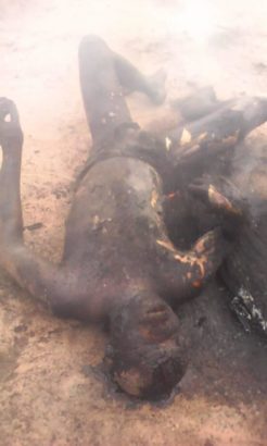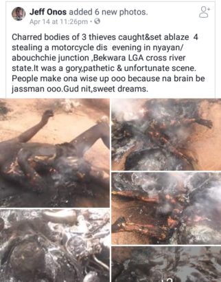 Charred bodies of 3 thieves caught&set ablaze 4 stealing a motorcycle dis evening in nyayan/abouchchie junction ,Bekwara LGA cross river state.It was a gory,pathetic & unfortunate scene. People make ona wise up ooo because na brain be jassman ooo.Gud nit,sweet dreams.