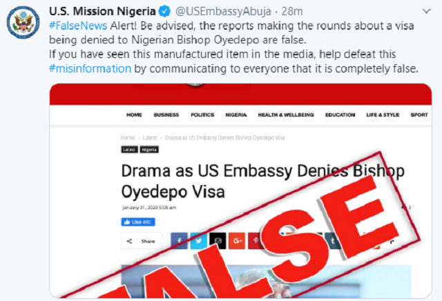 The US Embassy in Nigeria took to its twitter handle this afternoon to deny reports of rejecting clergyman, Bishop Oyedepo’s visa application. The embassy via its verified twitter handle, says the report is false.