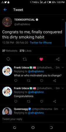 The popular Nigerian artist, Tekno today revealed that he has conquered the long time smoking habits.
