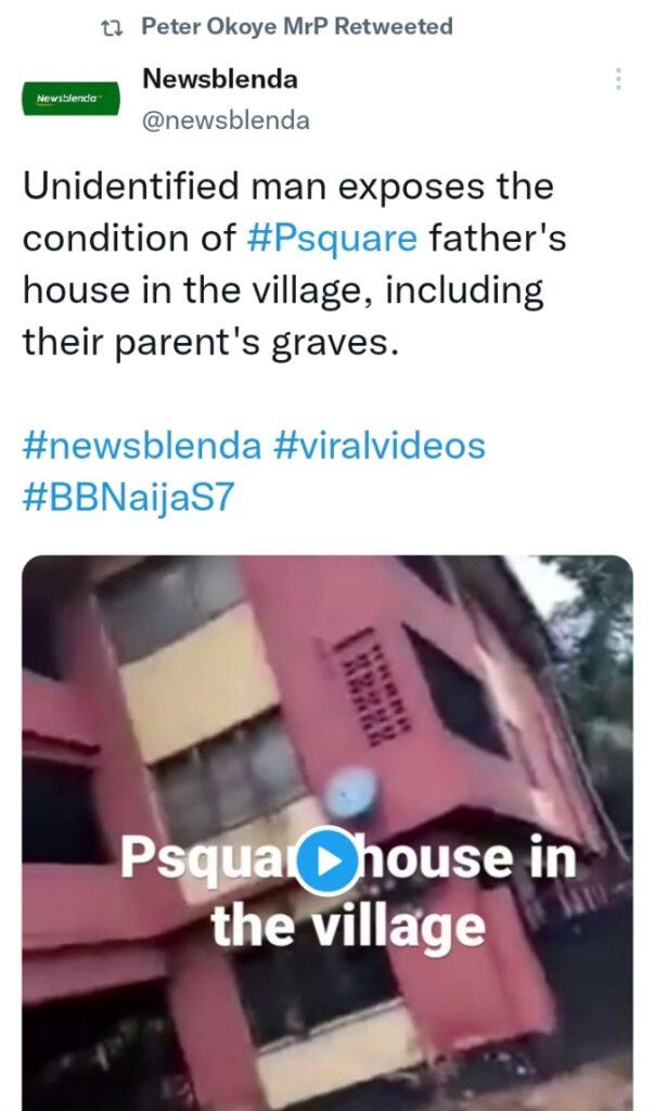 Reacting to this, Peter Okoye took to the microblogging platform Twitter to retweet a post and video of the alleged house.