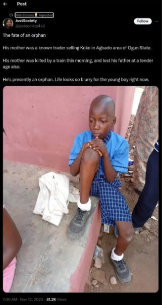 In her post, she wrote, “The fate of an orphan. His mother, a familiar face in Agbado as a trader selling koko, was killed by a train this morning. He lost his father at a young age as well. Now he’s an orphan, and life looks so blurry for him right now.”