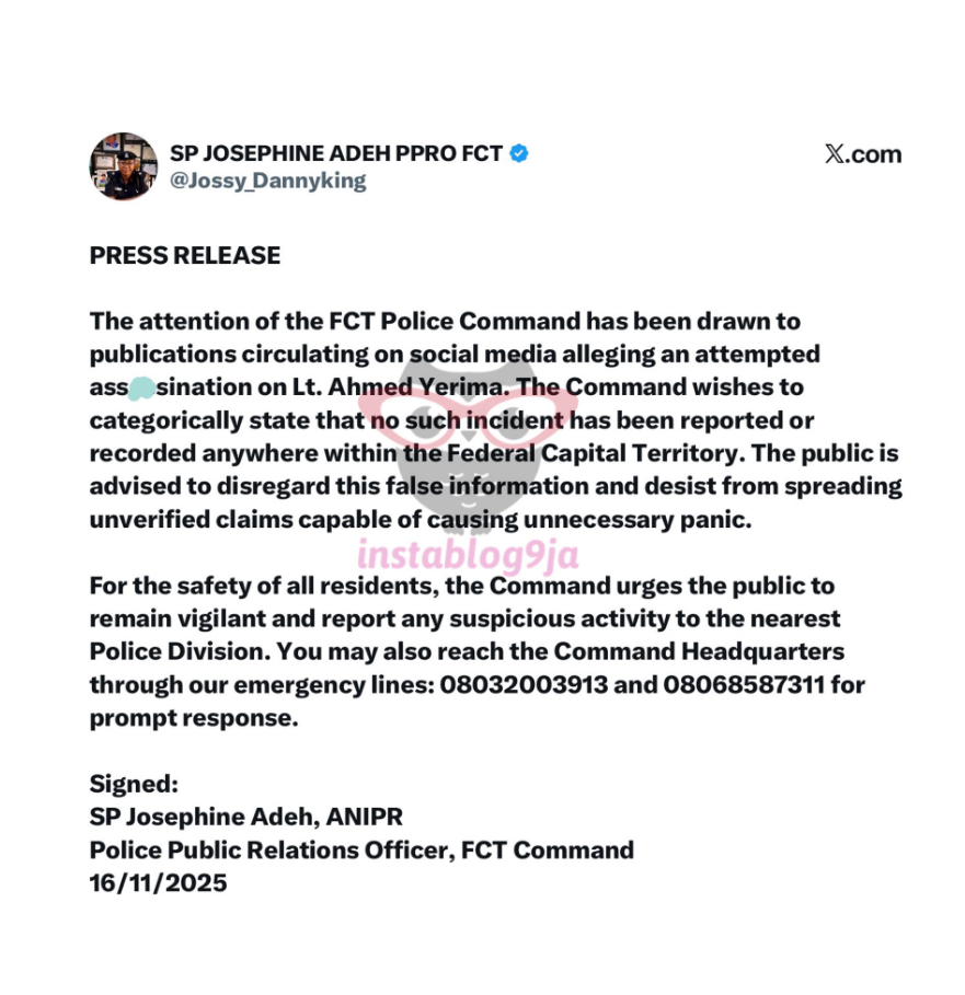 “The attention of the FCT Police Command has been drawn to publications circulating on social media alleging an attempted ass@ssination on Lt. Ahmed Yerima. The Command wishes to categorically state that no such incident has been reported or recorded anywhere within the Federal Capital Territory.”