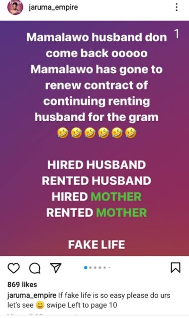 In a series of posts sighed on the page of Jaruma, she disclosed social media influencer whom she referred to as “Mamalawo” has renewed another contract to have a man by her side she called her husband: a life she described as fake life.
