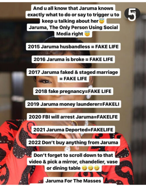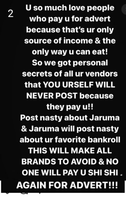 Jaruma in other allegations also slammed her client she referred to as “Mamalawo” to desist from telling her fans lies that her page is being reported by Jaruma.