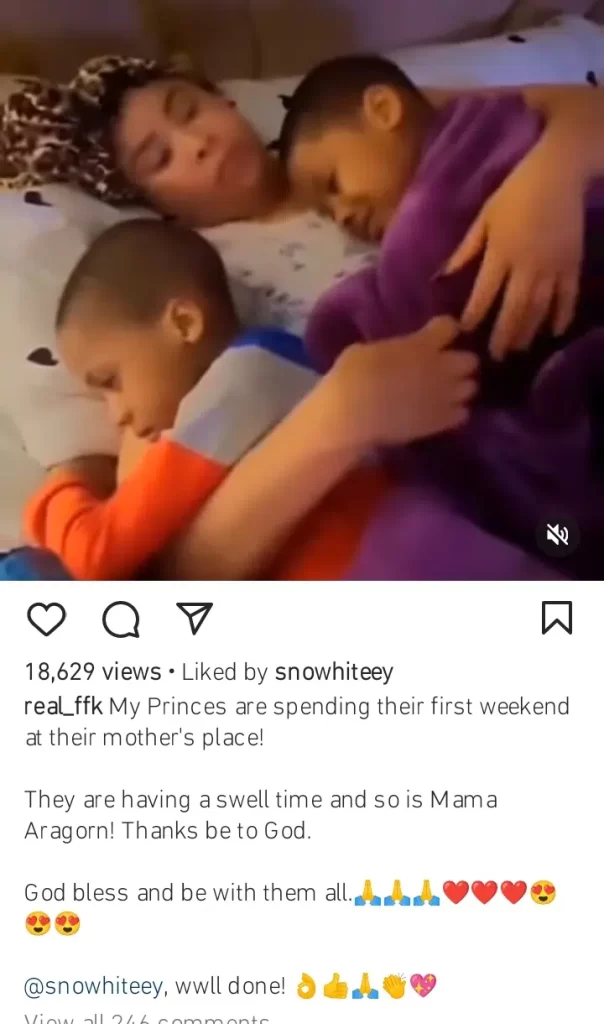“My princes are spending their first weekend at their mother’s place! They are having a swell time and so is Mama Aragorn! Thanks be to God. God bless and be with them all. @snowhiteey, well done!!”.