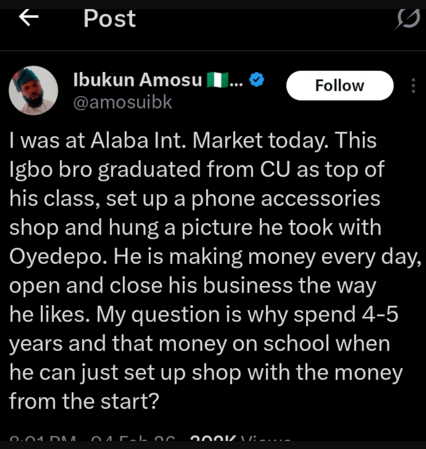 “I was at Alaba Int. Market today. This Igbo bro graduated from CU as top of his class, set up a phone accessories shop and hung a picture he took with Oyedepo. He is making money every day, open and close his business the way he likes. My question is why spend 4–5 years and that money on school when he can just set up shop with the money from the start?” the tweet read.