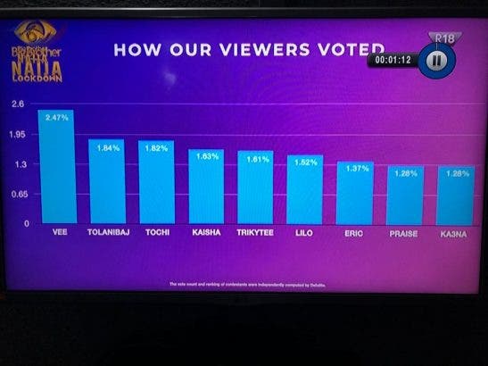 In the 1st round of voting by the fans, Vee had the highest percentage of votes, followed by Tolani Baj and then Tochi. Ka3na who was eventually evicted had the least number of votes.