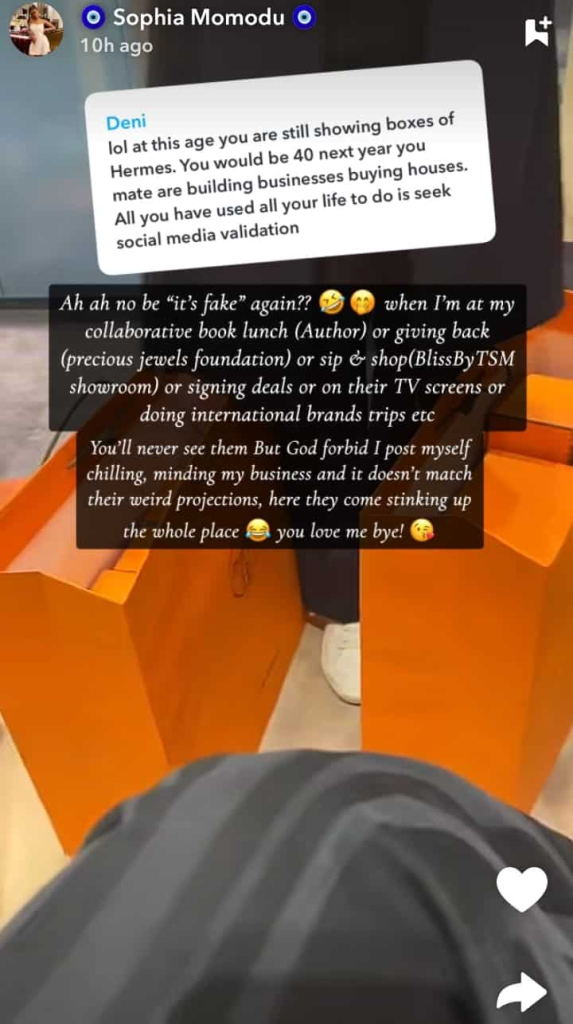 Sophia Momodu has hit back at a critic who mocked her for flaunting her Hermes bag.