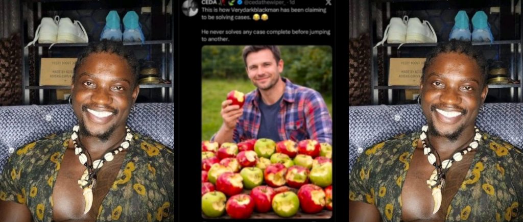 The meme, which circulated widely online, showed a man standing in front of several half-eaten apples. One user claimed the image perfectly illustrated Verydarkman’s method of handling cases leaving them incomplete.