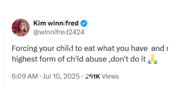 In a post circulating on social media, she argued that making a child eat what is available instead of what they actually want amounts to child abuse.