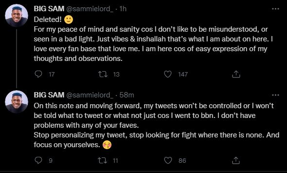 In a now-deleted tweet, Sammie admired the relationship existing between his colleagues while describing their fan base as a non-toxic one.