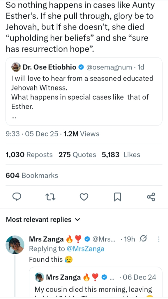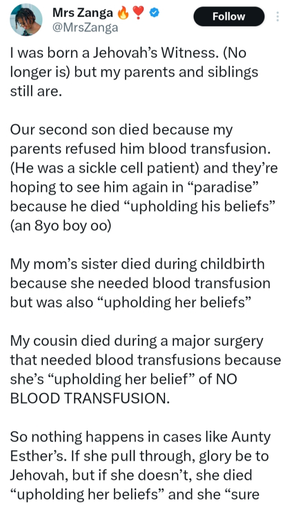 A former Jehovah’s Witness, known on X as Mrs. Zanga, has shared the heartbreaking experiences her family endured because of the religion’s strict stance against blood transfusions.