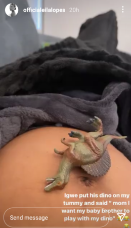 “Igwe put his dino on my tummy and said “mom I want my baby brother to play with my dino” she wrote.