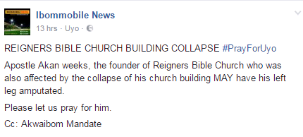 According to Facebook page Ibommobile News, the founder of the Uyo collapsed church, Apostle Akan Weeks, which claimed many lives, may have his leg amputated.