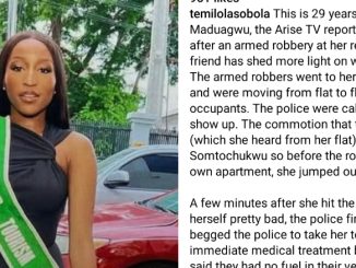 According to her cousin: “There was an armed robbery in her compound, she fell off the 3-story building and was unconscious. The police got to the scene, they pleaded with the police to take her to the hospital but their response was ‘THEY HAD NO Fuel.’ She died upon arrival.”