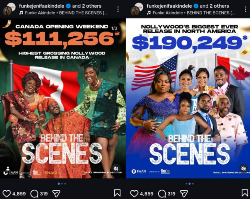 - Funke Akindele’s Behind The Scenes has become the highest-grossing Nollywood film in Canada and North America.