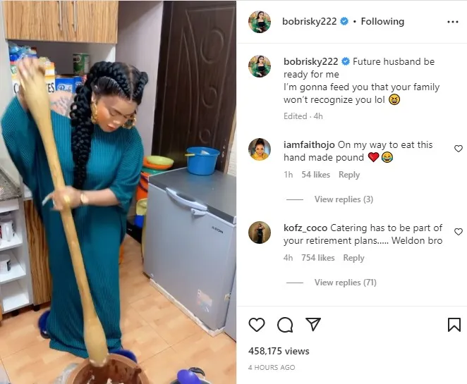- Bobrisky said whoever will marry him in the future should get ready to have a homely spouse who will prepare sumptuous meals