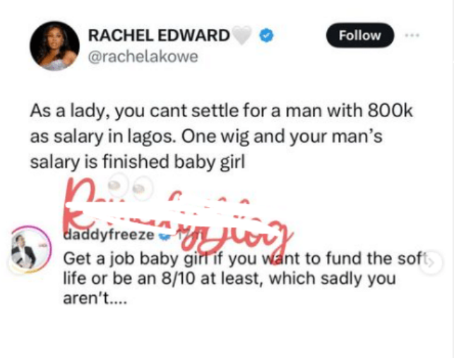 Daddy Freeze, a popular media personality, criticizes BBNaija contestant Rachel Edwards for urging women not to settle with guys who make N800,000 per month.