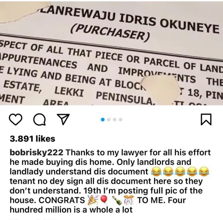“Thanks to my lawyer for app his effort he made buying dis home. Only Landlords and landlady understand this document. Tenant no dey sign app dis document here so they don’t understand. 19th I’m posting full pic of the house. Congrats to me. Four hundred million is a whole a lot”.