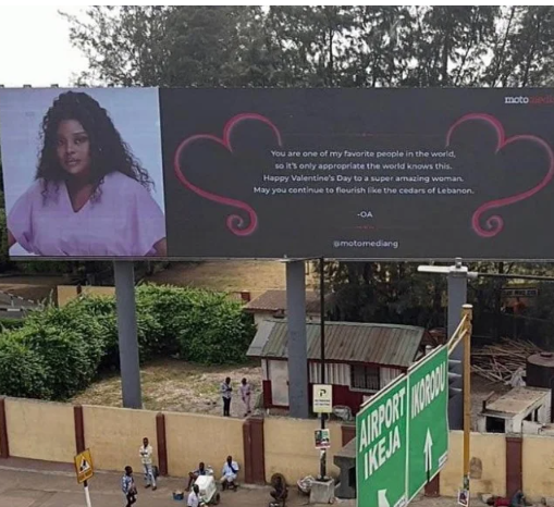 A Nigerian lady known as Osas has gushed over her boyfriend for renting a king-size billboard to celebrate her on February 14, Valentine’s Day.