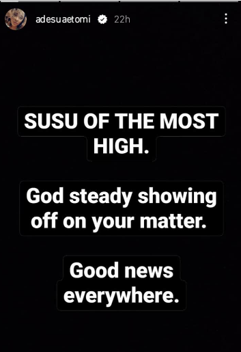 “Susu of the most high. God steady showing off on your matter. Good news everywhere”.