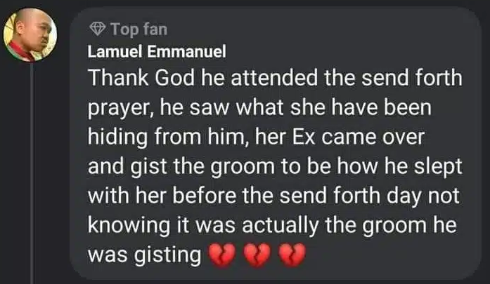 From one of the comments, it was gathered that the man got to know about her infidelity during the Sendforth prayers ( Plateau cultural event held for brides a few days before their wedding).