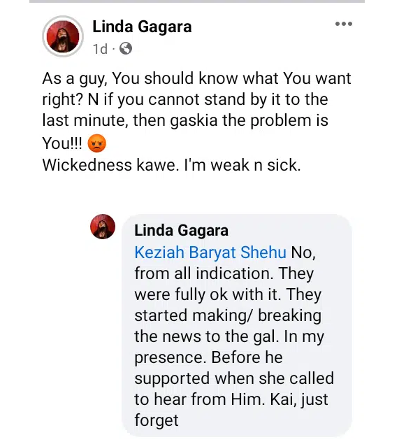 “Was just imagining the pain…how this Gal feels. Hmmmm…On Her supposed day of happiness. At dime minute. Just Time that I was to start up Her makeup to go to church. Oh Lord… I’ve never seen a thing like this before. Allah ya isa!!! Ladies go through lot. I’m sad. Really sad. Wallahi, Bai Yi ba.”