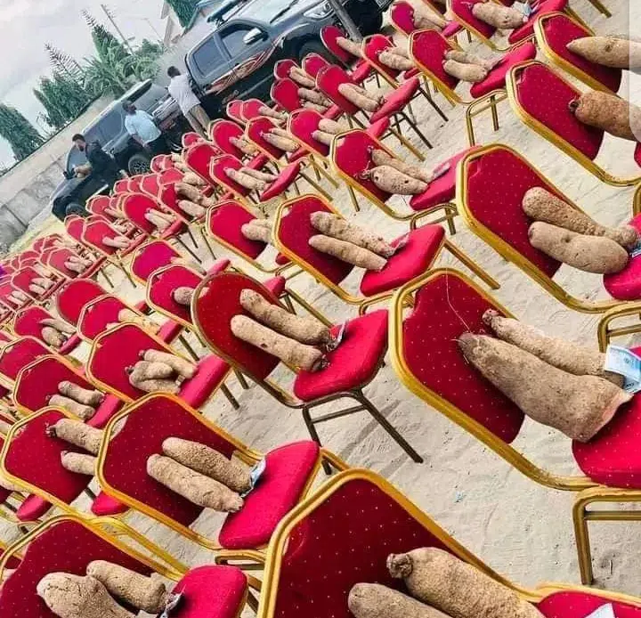 - In the photos making the rounds online, the chairs at the venue were carefully arranged and two tubers of yam together with new naira notes were spotted on the chairs.
