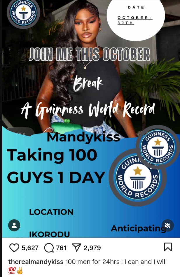 - Mandy Kiss announced plans to set a record by sleeping with 100 men in 24 hours, with the attempt slated for October 30, 2025, in Ikorodu, Lagos.