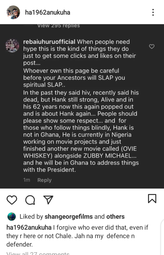 In the past they said hiv, recently said his dead, but Hank still strong, Alive and in his 62 years now this again popped out and is about Hank again… People should please show some respect… and for those who follow things blindly, Hank is not in Ghana, He is currently in Nigeria working on movie projects and just finished another new movie called (OVIE WHISKEY) alongside ZUBBY MICHAEL… and he will be in Ghana to address things with the President.”