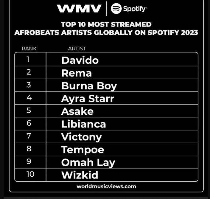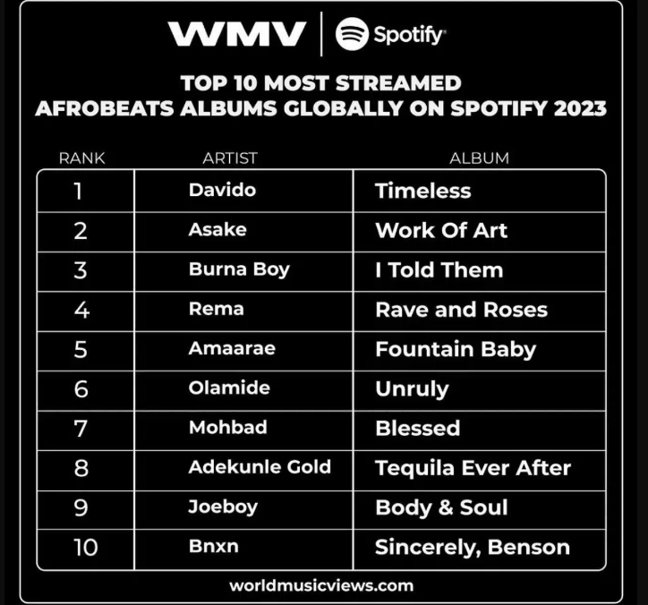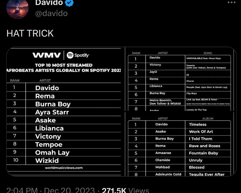 Davido shared three charts in the aforementioned post, which has received a lot of attention. In one, he was named the most streamed Afrobeat artist in the world for 2023.