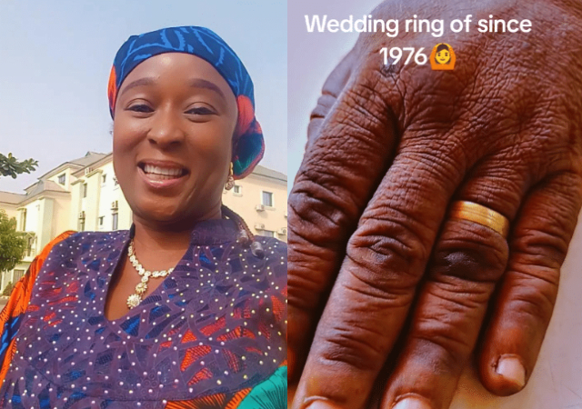 Oby Asiegbu, a Nigerian woman, has piqued the interest of many online by displaying her mother’s wedding band, which has been securely attached to her finger since 1976.