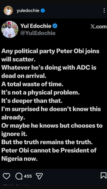 Taking to his social media page, the actor claimed that any political party Peter Obi aligns with would face internal challenges, adding that his reported involvement with the African Democratic Congress (ADC) would not succeed.