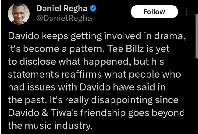 In his words: “Davido keeps getting involved in drama, it’s become a pattern. Tee Billz is yet to disclose what happened, but his statements reaffirms what people who had issues with Davido have said in the past. It’s really disappointing since Davido & Tiwa’s friendship goes beyond the music industry.”