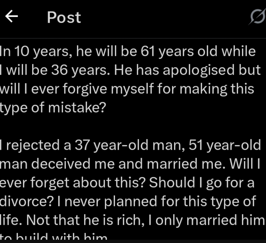 ‎I rejected a 37 year-old man, 51 year-old man deceived me and married me. Will I ever forget about this? Should I go for a divorce? I never planned for this type of life. Not that he is rich, I only married him to build with him.