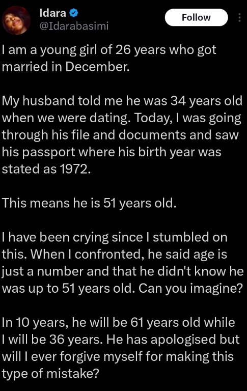 The woman, identified as @Idarabasimi on X (formerly Twitter), revealed that she got married in December 2025 but chose to keep her husband’s identity private. According to her, during their relationship, her husband told her he was 34 years old.