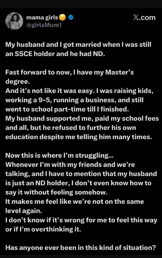The lady, who shared her experience on X (formerly Twitter) via the handle @girlsMum1, explained that she got married when she only had a Senior Secondary School Certificate Examination qualification, while her husband held a National Diploma.