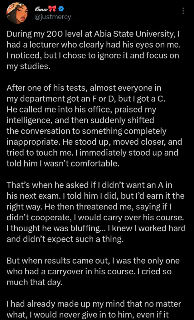 The account has reignited concerns about abuse of authority in higher institutions and the challenges faced by female students in academic settings.