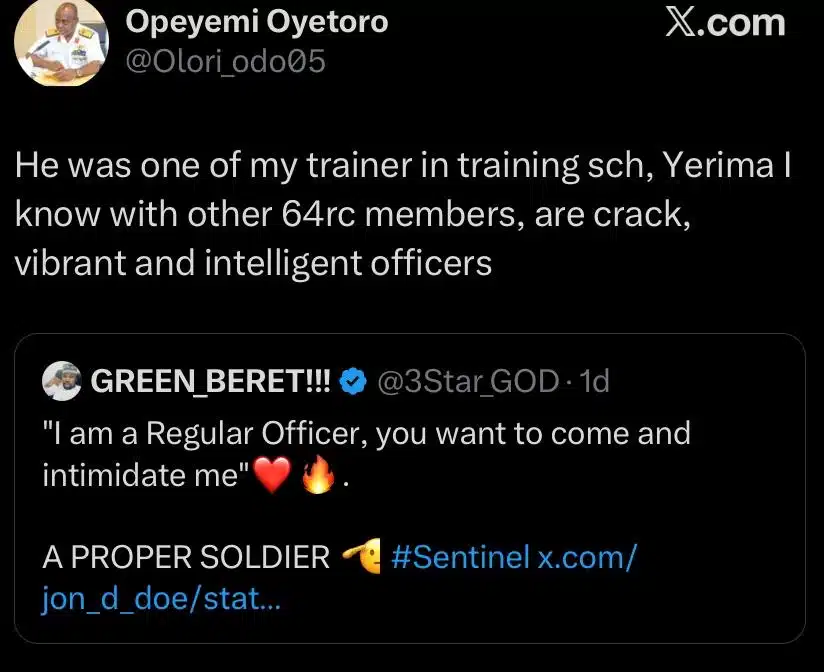 The officer, who goes by @olori_odo05 on X (formerly Twitter), recounted that Yerima served as one of his instructors years ago. He highlighted that Yerima distinguished himself through his discipline, focus, and outstanding leadership abilities.