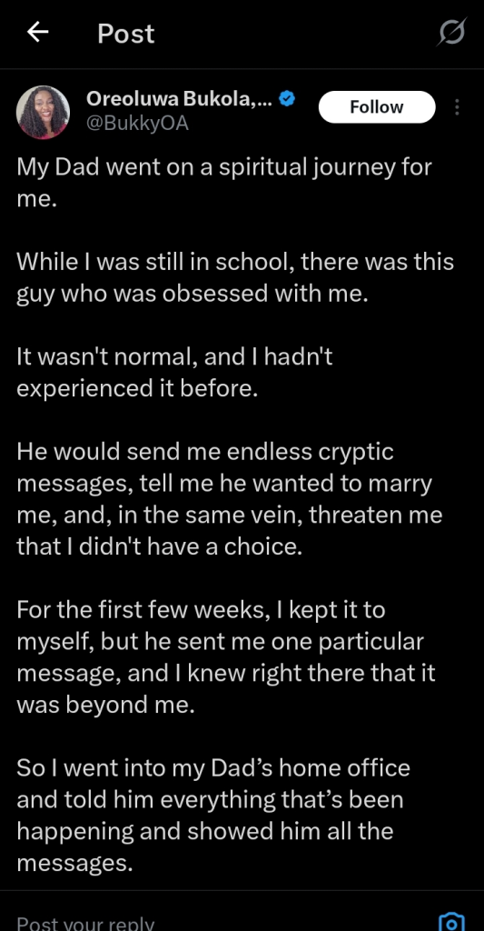 The user, identified as @BukkyOA, explained that the incident happened while she was still in school. According to her, the man who claimed he wanted to marry her began sending unsettling and cryptic messages, including threats. For weeks, she kept the situation to herself.