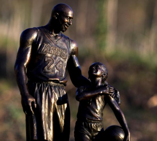 The bronze statue depicts Kobe and Gigi wearing basketball uniforms and sharing a loving glance as Gigi holds her father’s hand as it rests on her shoulder.