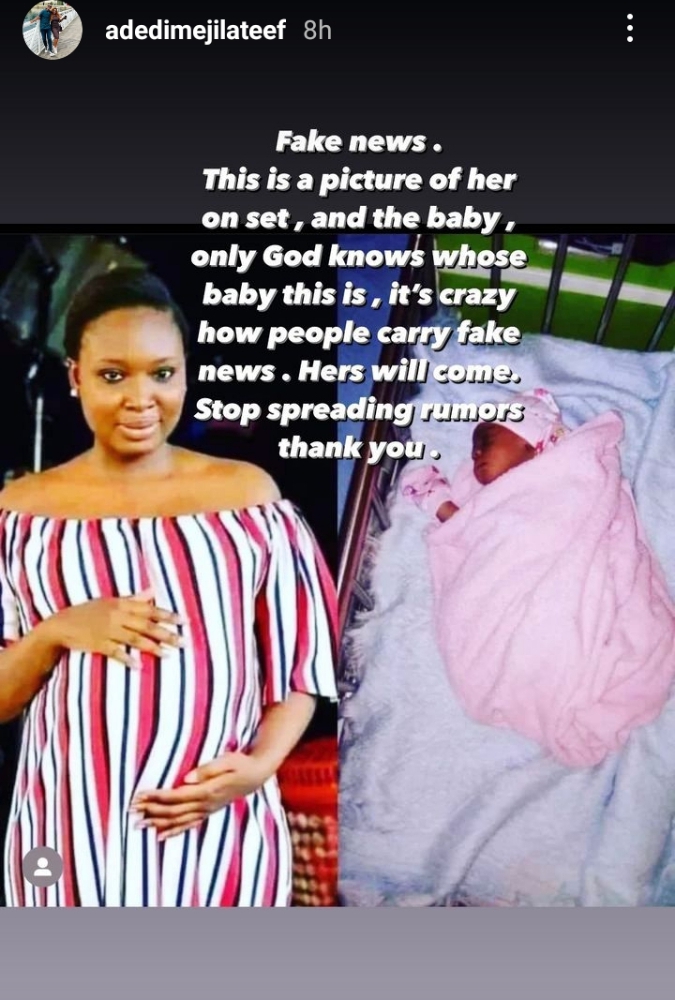 “This is a picture of her on set, and the baby. Only God knows whose baby this is. It’s crazy how people carry fake news. Hers will soon come, so stop spreading fake rumors”.